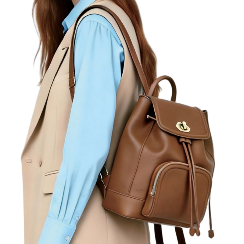 This stylish brown PU leather compact backpack combines functionality and sophistication in a sleek design. The practical yet fashionable swagger bag is perfect for women on the go, providing ample storage while maintaining a chic look.