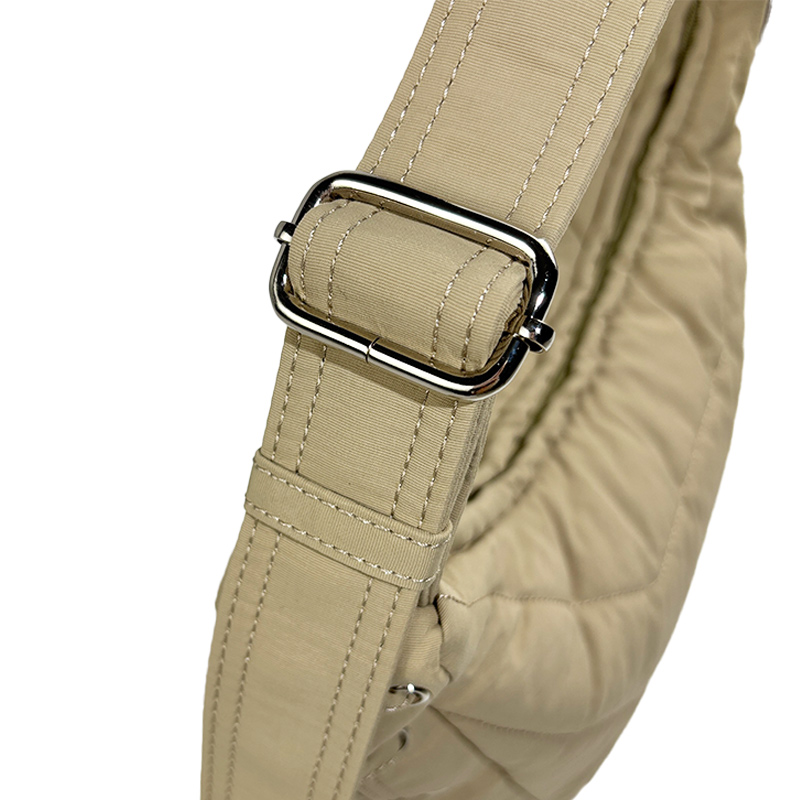 This dumpling-inspired casual shoulder bag is a highly functional item. The Moon Angle Bag is featured with a softly constructed but structured crescent moon shape quilted from a lightweight durable nylon material, and exudes a lazily retro style. A real essential for downtime hunters.