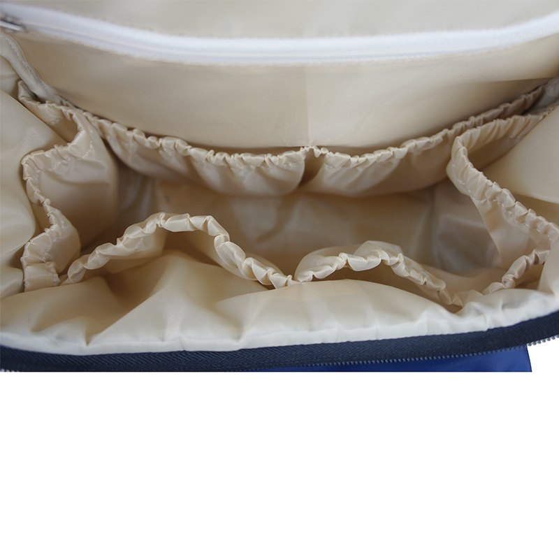 The structured front zip pocket is slightly raised for a three-dimensional look, with a soft half-round zipper shape that matches the baby-friendly theme. Inside, there are two elastic insulated pockets lined with aluminum foil, ideal for keeping babybottles warm. A stitched elastic loop on one side neatly holds utensils such as spoons or chopsticks.
