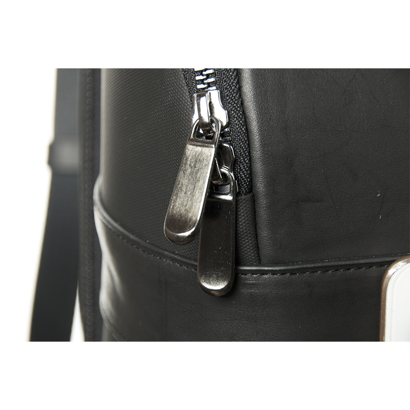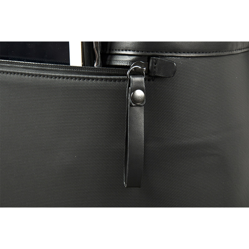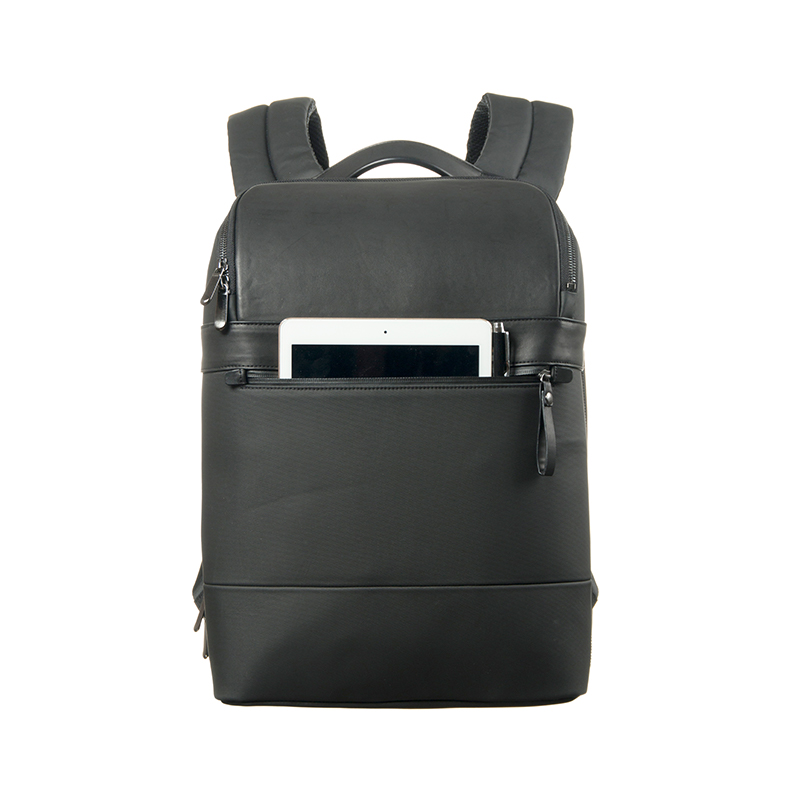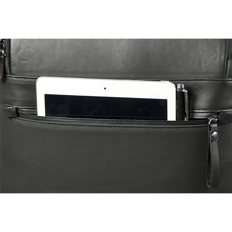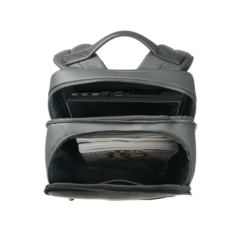 2.14 lbThe exterior integrates two contrasting materials: refined leather on the upper front panel and durable composite technical fabric across the remaining body. This material combination enhances structural stability while providing water resistance, dirt protection, and abrasion durability—making it ideal for both urban commuting and outdoor use as an outdoor backpack. The rigid 3D form ensures the bag maintains its sharp profile even when fully packed.