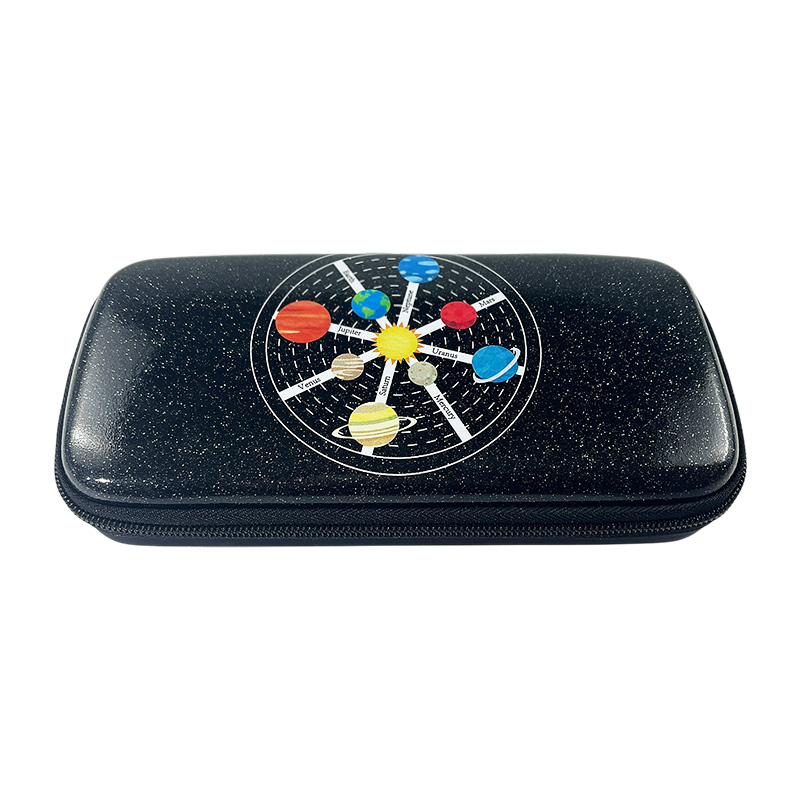 0.26 lbCrafted from durable EVA material, this black pencil case combines a sleek, protective structure with a shimmering black glitter PU exterior. The colorful planet print adds a fun, celestial touch, making this pencil box ideal for kids who are fascinated by space.