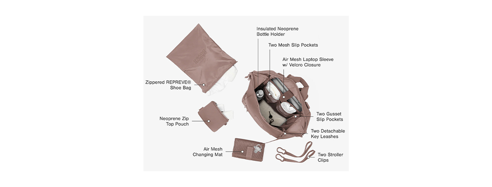 Zusätzliches Merkmal 2: Jeder Dagne Dover Indi Wickelrucksack wird mit einer REPREVE®-Wickelunterlage aus Recyclingmaterial, einem Schuhbeutel und einem Staubbeutel geliefert.