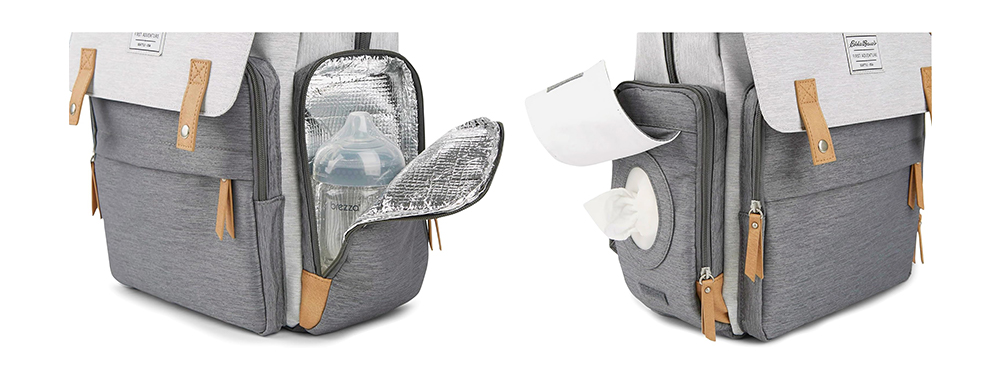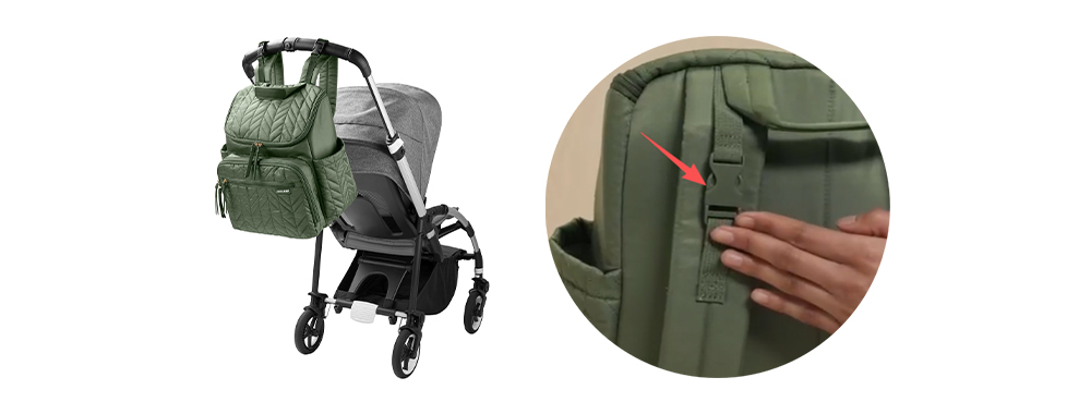 Zusätzliche FunktionDie Tasche wird mit Kinderwagengurten geliefert, und an der Unterseite der Schultergurte des Rucksacks befinden sich verstellbare Gummibänder, wodurch sich der Rucksack leicht am Kinderwagengriff befestigen lässt und die Schultern entlastet werden.
